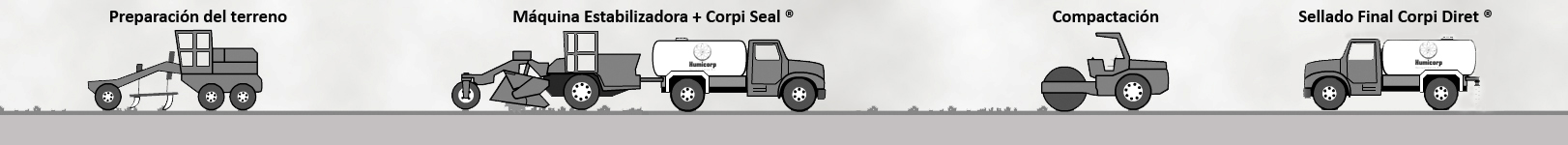 El material inerte de integración a la curva granulométrica y el eventual cemento o cal, vienen aplicados previamente sobre la pavimentación existente y vienen englobados en el proceso de reciclado mientras la máquina estabilizadora va avanzando. La secuencia de las máquinas que hay que utilizar en el proceso (camión cuba de agua, camión cuba de copolímeros, estabilizadora, compactadora) dan origen a un “tren de reciclado”. La estabilizadora por la potencia que tiene funciona de locomotora y traína o empuja las otras máquinas. Utilizando este proceso de ejecución humicorp puede grantizar unos resultados excelentes.